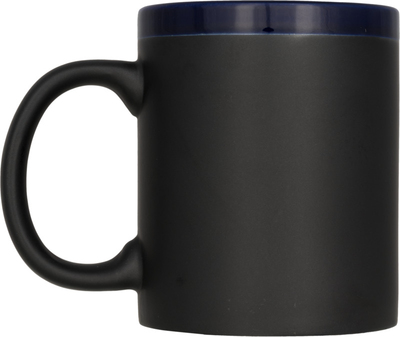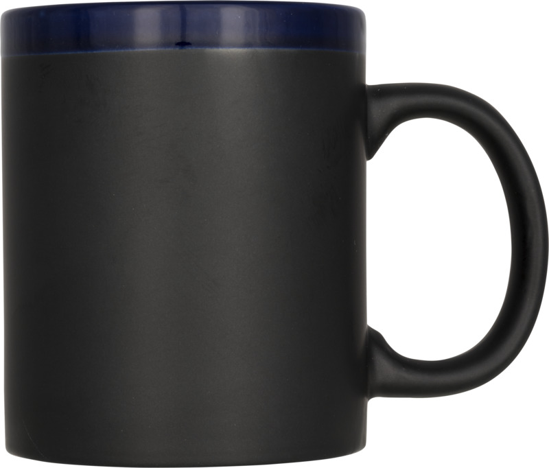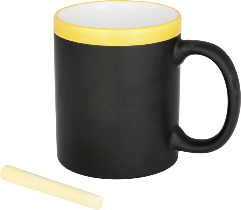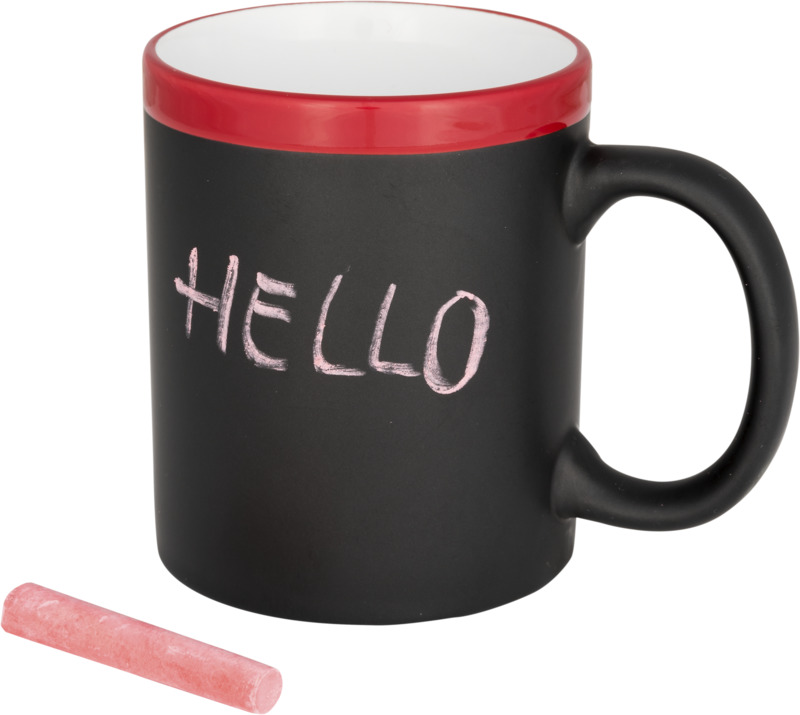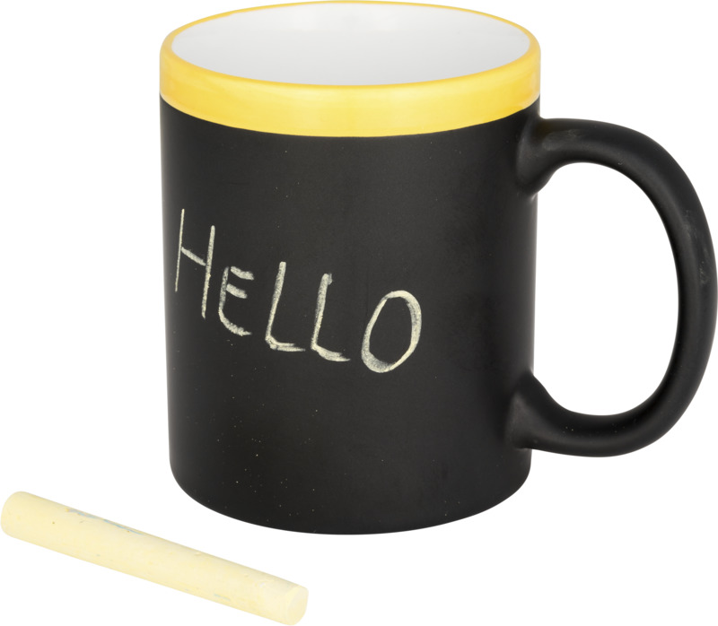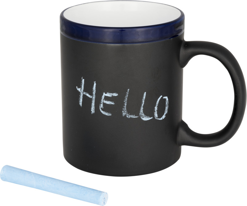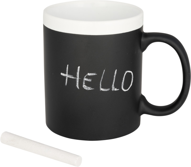 Cană ceramică cu cretă 330 ml. Această cană poate fi personalizată scriind pe finisajul dedicat cu cretă. Creta este inclusă. EN12875-1 conform cu siguranța pentru mașina de spălat vase, de asemenea, atunci când este decorat. Cana se livreaza într-o cutie de carton alb. Dimensiuni: 9,5×8 cm.