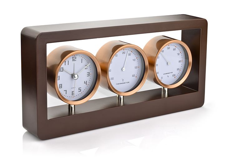 Ceas cu alarma, termometru si higrometru dispuse intr-o carcasa din lemn. Este nevoie de 1 buc baterie AA care nu este inclusa in produs.
